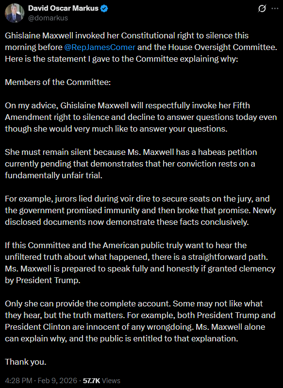 Al di là delle dichiarazioni del suo legale, Maxwell ha scelto di non collaborare durante l’audizione. Si è avvalsa del Quinto Emendamento della Costituzione — che tutela il diritto a non autoincriminarsi — rifiutando di rispondere alle domande dei deputati.
