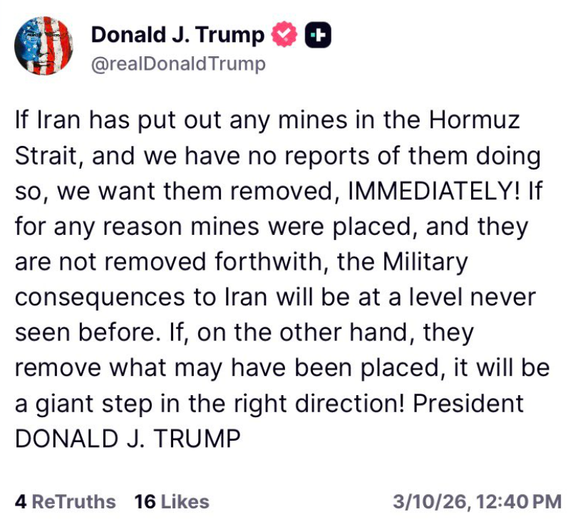 Trump ha reagito alle nuove minacce iraniane con un post su Truth Social: "Se davvero l'Iran ha posizionato mine nello Stretto di Hormuz, e non abbiamo rapporti che lo confermino, pretendiamo che vengano rimosse immediatamente". In caso contrario, ha aggiunto, l'Iran subirà "conseguenze militari a un livello mai visto prima".