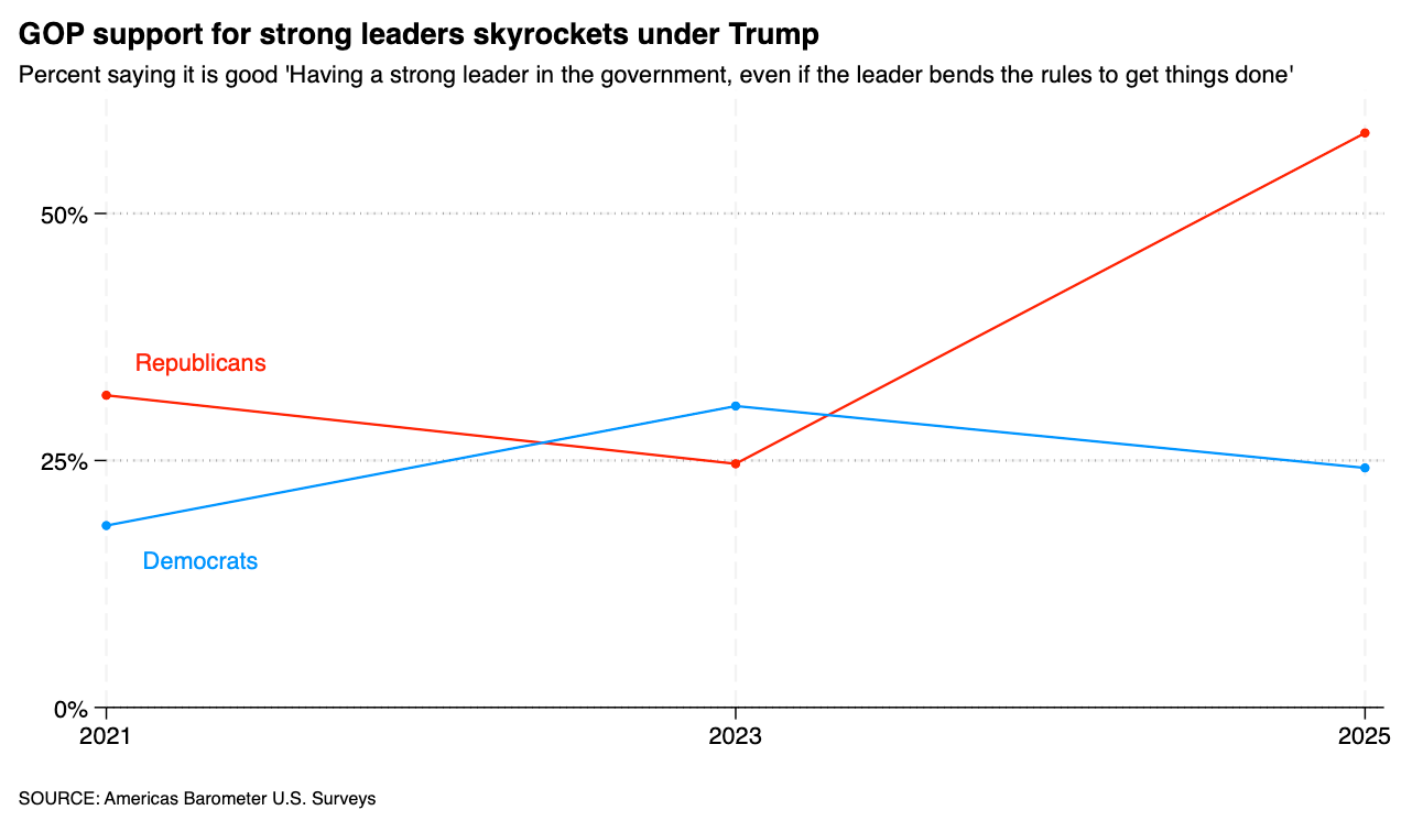 Il sondaggio chiedeva agli intervistati se considerassero positiva questa forma di governo: "Avere un leader forte al governo, anche se piega le regole per fare le cose". La domanda è stata posta in tre momenti distinti: due volte durante la presidenza Biden, nel 2021 e nel 2023, e una volta nel 2025, sotto Trump.