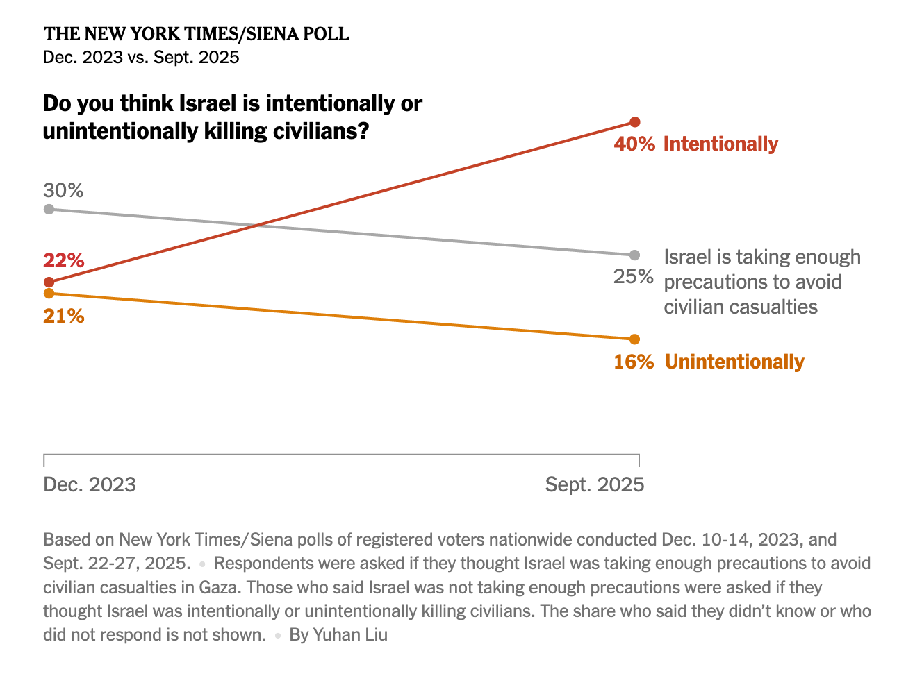 Più di otto democratici su dieci hanno dichiarato che Israele dovrebbe fermare la guerra anche se il paese non avesse raggiunto i suoi obiettivi, un aumento notevole rispetto al circa 60 percento che diceva lo stesso due anni fa. Quasi sei democratici su dieci credono che Israele stia uccidendo intenzionalmente i civili, il doppio rispetto alla quota che diceva lo stesso nel 2023.