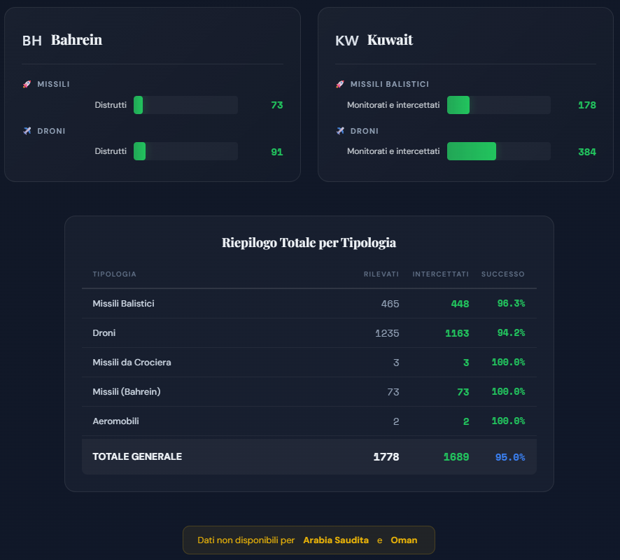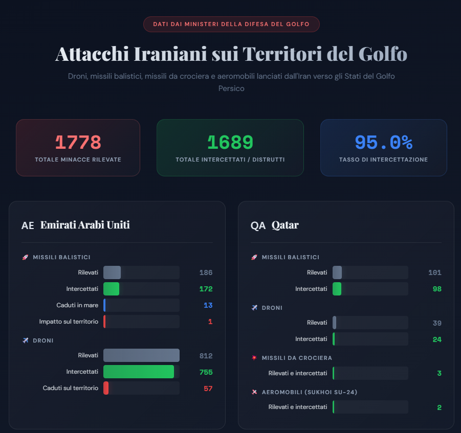 L'Iran ha inoltre adottato una strategia di guerra d'attrito ispirata alla tattica russa in Ucraina, colpendo i Paesi della regione con grandi quantità di droni e missili a basso costo. La scommessa è che i sistemi di difesa aerea avversari esauriscano le munizioni prima che Teheran finisca le proprie scorte. Secondo Fabian Hoffmann, esperto di missili dell'Università di Oslo, citato dal Wall Street Journal, al ritmo attuale di utilizzo degli intercettori le difese aeree regionali non potranno reggere più di una settimana, con i primi problemi attesi nel giro di pochi giorni.