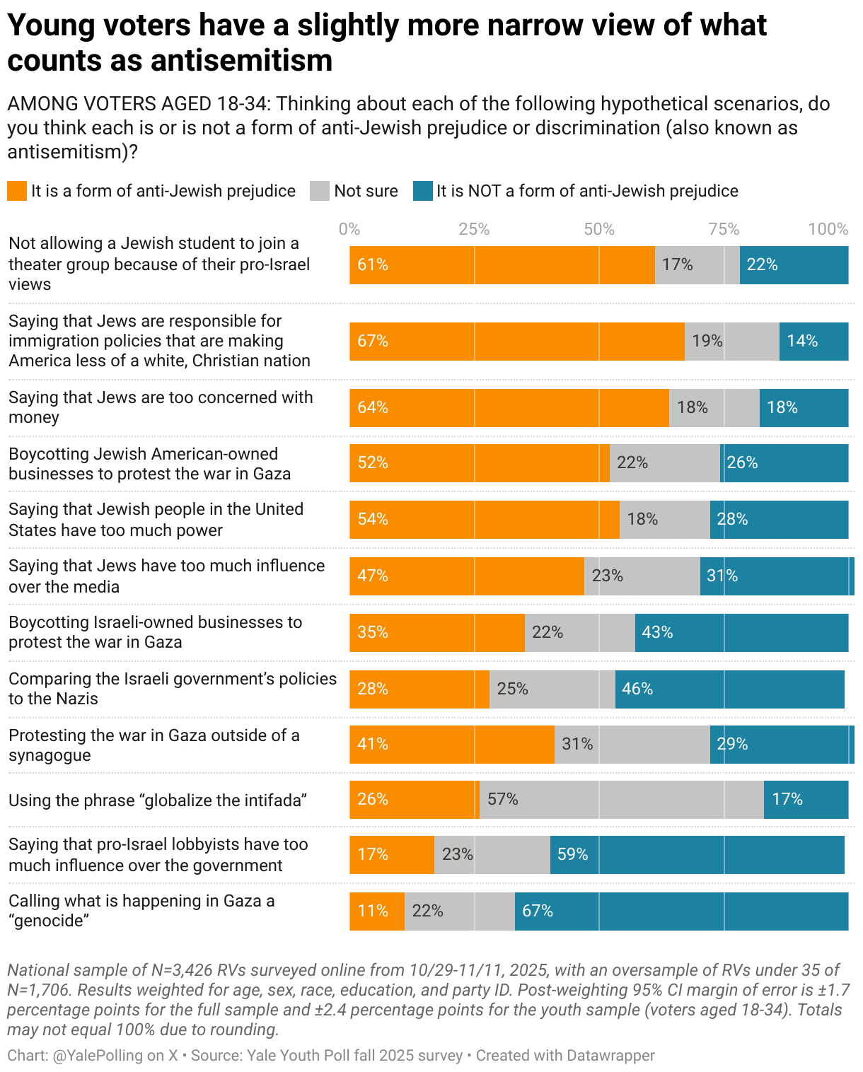 Un sondaggio dell'università di Yale rivela che le posizioni antisemite sono più comuni tra i giovani elettori, soprattutto quelli "estremamente conservatori". Quasi la metà degli under 30 vuole interrompere completamente gli aiuti militari a Israele.