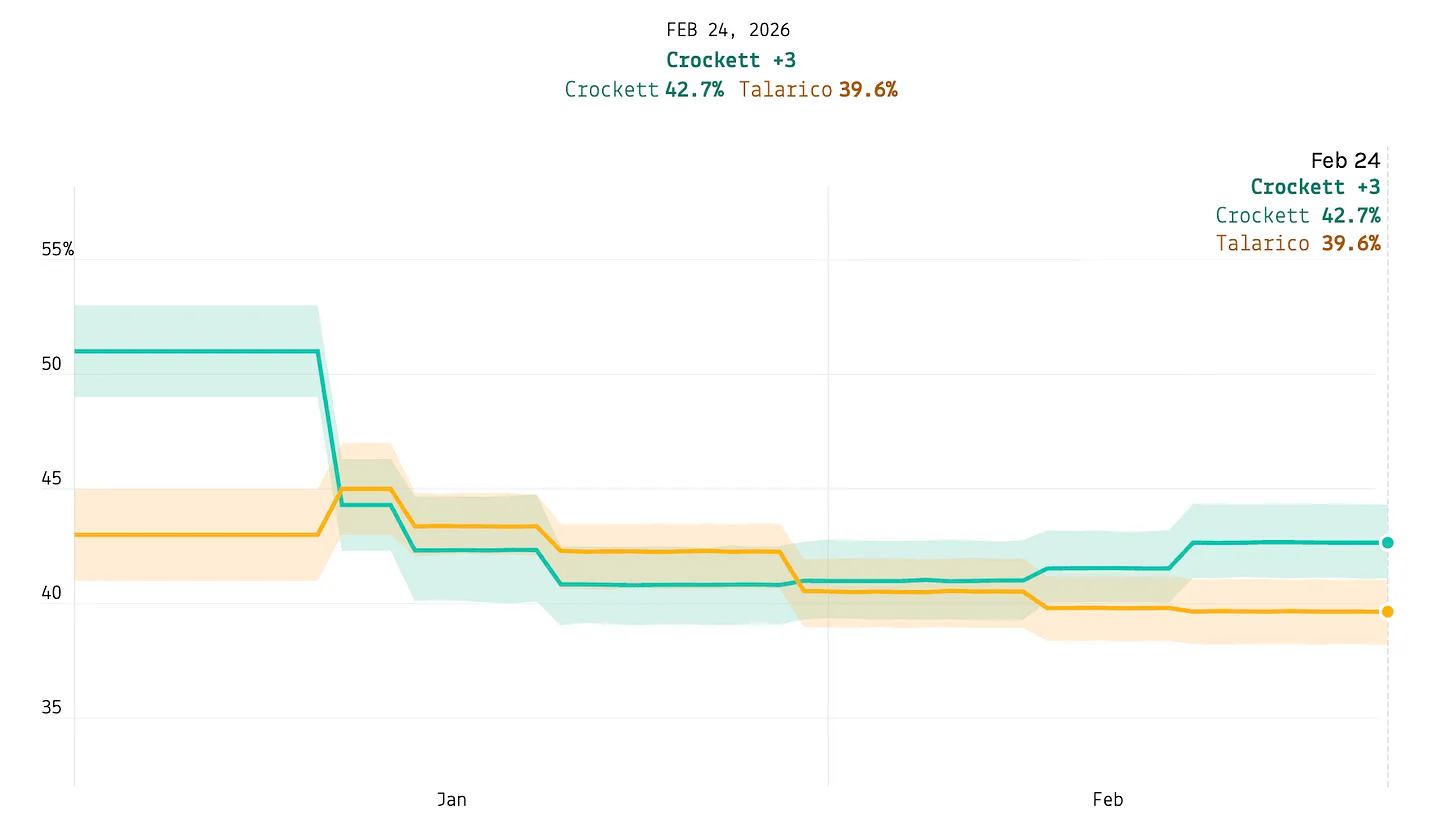 Sul fronte democratico, la sfida è tra la deputata federale Jasmine Crockett e il deputato statale James Talarico. La media dei sondaggi assegna a Crockett il 42,7% contro il 39,7% di Talarico, un margine di tre punti che rientra nel margine di errore statistico dei rilevamenti.