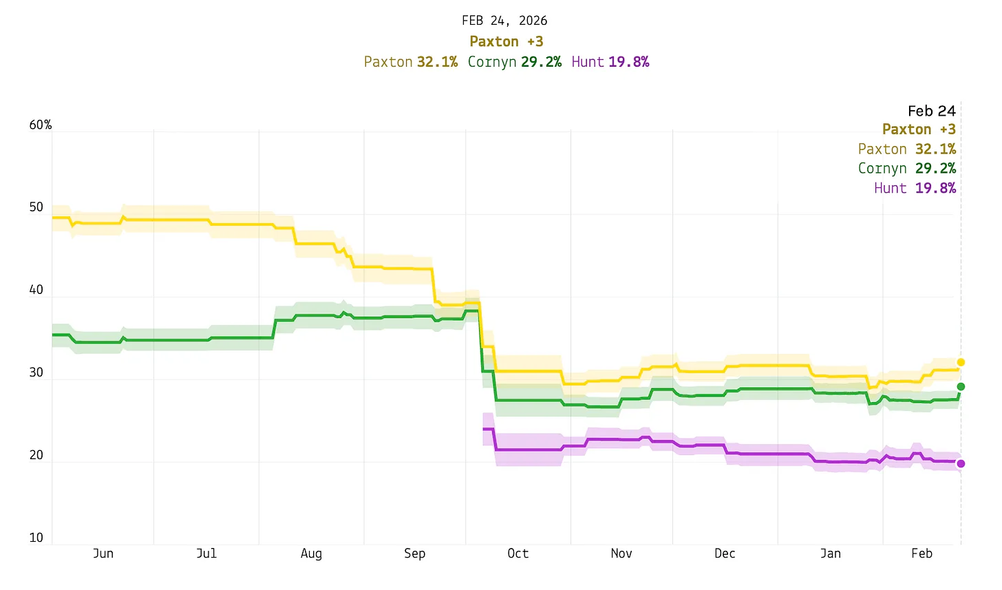 Sul fronte repubblicano, la corsa vede tre candidati principali. Il procuratore generale dello Stato Ken Paxton guida la media dei sondaggi con il 32,1% delle preferenze, seguito dal senatore uscente John Cornyn al 29,2% e dal deputato federale Wesley Hunt al 19,8%. Un vantaggio di Paxton di soli tre punti, che si è ridotto significativamente da quando Hunt è entrato in gara, nell'estate del 2025. Poiché nessun candidato sembra destinato a superare il 50%, è molto probabile che la corsa si concluda con un ballottaggio il 26 maggio tra i primi due classificati. Un sondaggio ipotetico su quel ballottaggio tra Paxton e Cornyn dà Paxton in vantaggio con il 51% contro il 40%.