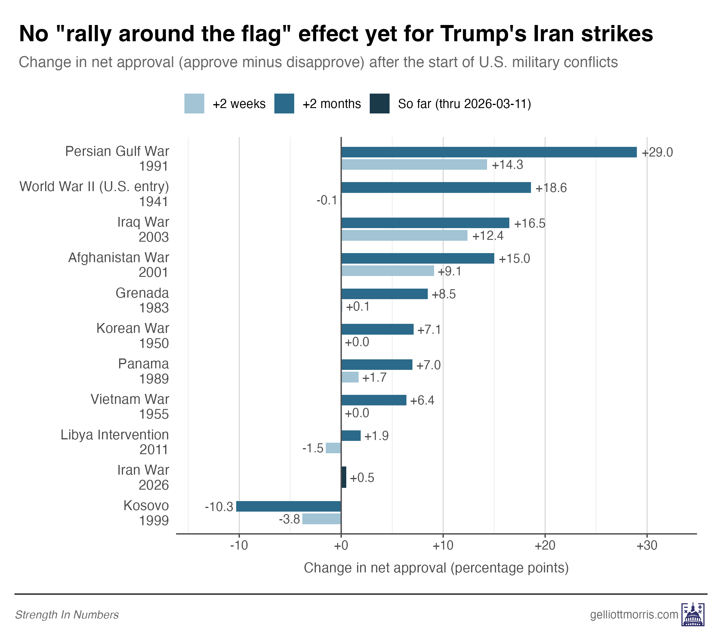 La guerra in Iran di Trump non soddisfa praticamente nessuna di queste condizioni. Non c'è stato uno shock improvviso: sono stati gli Stati Uniti ad avviare l'azione, dopo settimane di retorica crescente. Non c'è consenso bipartisan: i democratici hanno definito il conflitto una "guerra di scelta" fin dal primo giorno. La copertura mediatica è frammentata, divisa tra gli attacchi stessi, le vittime civili, l'opposizione del Congresso e le proteste. Trump non ha chiesto l'autorizzazione né al Congresso né alle Nazioni Unite, e un sondaggio Quinnipiac del 9 marzo ha rilevato che il 59 per cento degli americani riteneva che avrebbe dovuto farlo. Infine, l'elettorato è blindato dalla polarizzazione: la disapprovazione democratica degli attacchi si colloca tra l'85 e il 90 per cento, circa il 60 per cento degli indipendenti si dichiara contrario e il 75-85 per cento dei repubblicani approva. Trump è entrato nel conflitto con un gradimento netto di -19, il più basso di qualsiasi presidente all'inizio di un'azione militare nella storia dei sondaggi.