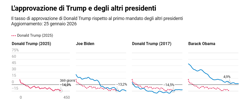 Dopo il primo anno di questa presidenza, tra le polemiche sull’ICE e i venti di shutdown, l’approvazione di Trump si ritrova in un limbo, vicina al dato che aveva a questo stesso punto nel primo mandato e simile anche ai numeri di Biden nel medesimo periodo.
