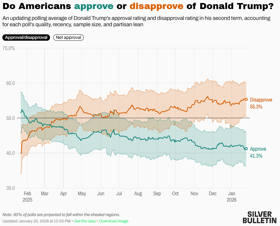 Il sito Silver Bulletin (che fa una propria media aggiustata di tutti i sondaggi, dandone un peso maggiore o minore in base al bias storico e al rating delle firme che li svolgono) segna una media generale di 41,3% (-0,8) - 55,3% (+0,1). In totale un net approval di -14 (-0,9).