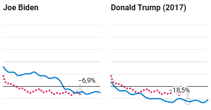 Con questa retromarcia, il gradimento di Trump subisce degli effetti: sebbene rimanga di gran lunga superiore rispetto a quello del primo mandato - che rimane il punto più basso di sempre per qualsiasi presidente -, torna ora ad essere inferiore nel confronto diretto con Joe Biden. Le due curve sono appaiate, con un andamento generale però molto diverso: stabile per Trump, in costante declino per l’ex presidente.