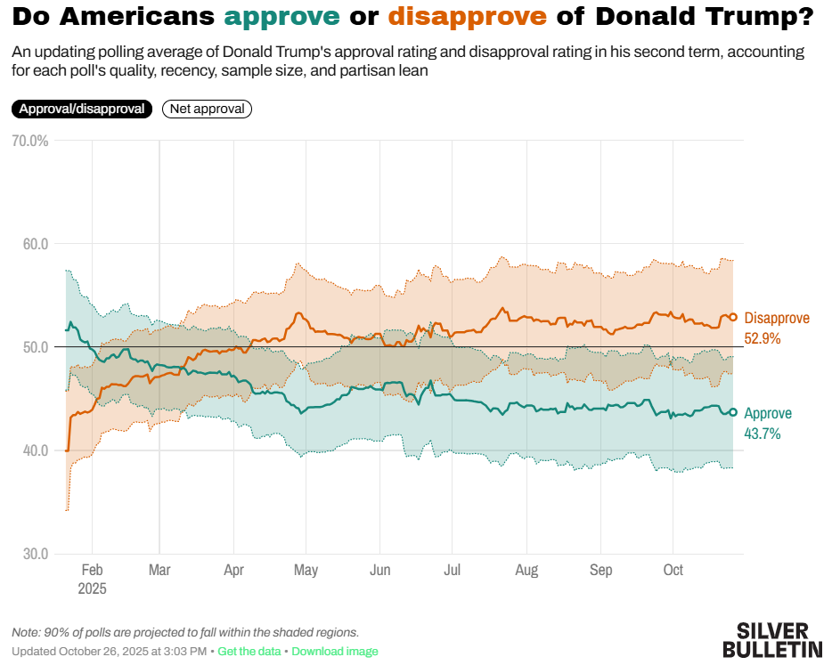 Il sito Silver Bulletin (che fa una propria media aggiustata di tutti i sondaggi, dandone un peso maggiore o minore in base al bias storico e al rating delle firme che li svolgono) segna una media generale di 43,7% (-0,6) - 52,9% (+1). In totale un net approval di -9,2 (-1,6).