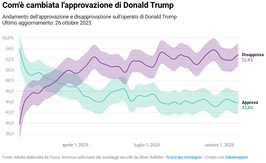 Il tasso di approvazione di Trump oscilla tra il 44% e il 45%, mentre il tasso di disapprovazione si aggira intorno al 52%-53%, numeri sostanzialmente in linea rispetto a quelli che aveva nell’ultima parte del suo primo mandato.