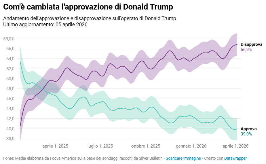 Il tasso di approvazione di Trump oscilla tra il 39% e il 41%, mentre il tasso di disapprovazione si aggira intorno al 57%, cifre vicine ai minimi del mandato di Joe Biden.