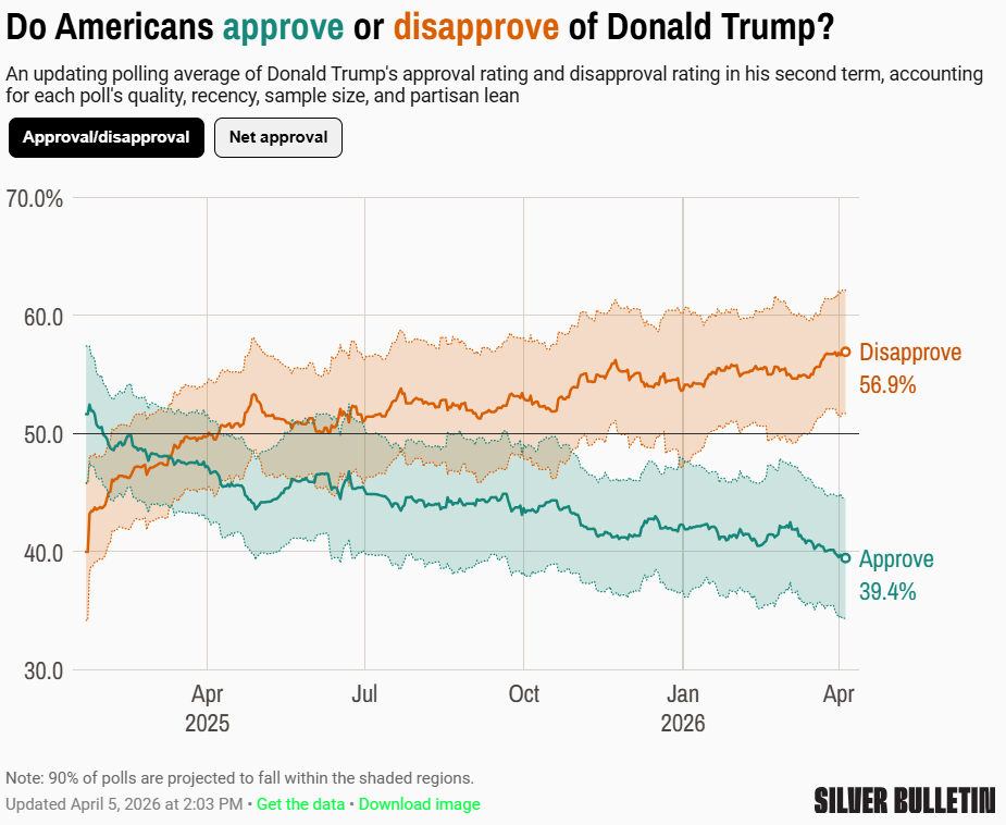 Il sito Silver Bulletin (che fa una propria media aggiustata di tutti i sondaggi, dandone un peso maggiore o minore in base al bias storico e al rating delle firme che li svolgono) segna una media generale di 39,4% (-0,7) - 56,9% (+0,2). In totale un net approval di -17,5 (-0,9).