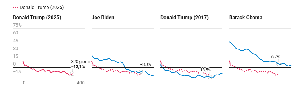 In questo momento la popolarità rimane superiore solo a quella del suo primo mandato - che resta il punto più basso di sempre per qualsiasi presidente -, con le due curve che tornano a distanziarsi.