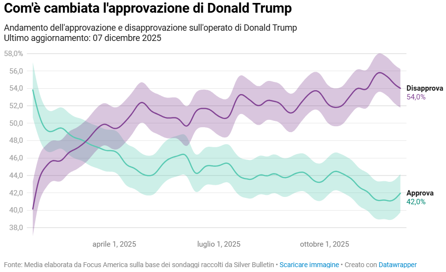 Il tasso di approvazione di Trump oscilla tra il 41% e il 43%, mentre il tasso di disapprovazione si aggira intorno al 54%-55%, numeri simili a quelli che aveva Biden nell’ultima parte del suo mandato.