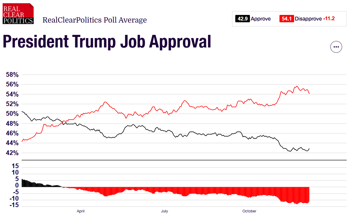 Dopo un grande periodo negativo, il gradimento di Trump ha smesso di tracollare e gode di una sostanziale stabilità con un leggero miglioramento, sebbene i numeri del pre-shutdown siano molto distanti.