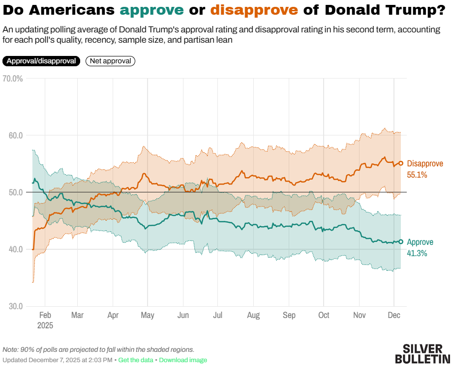 Il sito Silver Bulletin (che fa una propria media aggiustata di tutti i sondaggi, dandone un peso maggiore o minore in base al bias storico e al rating delle firme che li svolgono) segna una media generale di 41,3% (+0,3) - 55,1% (-0,3). In totale un net approval di -13,8 (+0,6).