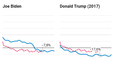 I numeri sono stabilmente superiori nel confronto diretto con Joe Biden, che quattro anni fa in questo preciso momento viveva un periodo di deciso declino. Le due curve sono appaiate, con un andamento generale molto diverso.