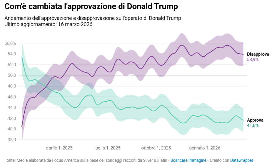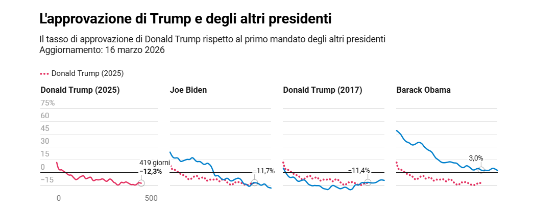 Sul nostro sito trovate i grafici con il confronto con tutti i primi mandati degli altri presidenti, con una frequenza di aggiornamento pari a 8 volte al giorno. Il tasso di approvazione di Trump oscilla tra il 41% e il 43%, mentre il tasso di disapprovazione si aggira intorno al 54%-55%, cifre simili a quelle che aveva Biden nell’ultima parte del suo mandato.