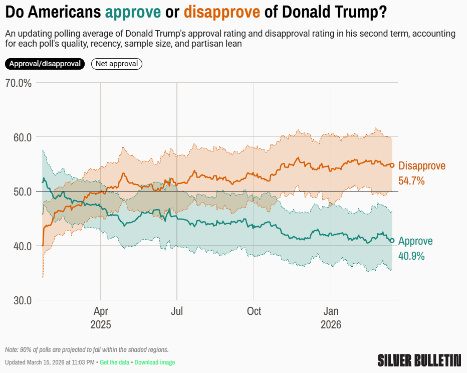 Il sito Silver Bulletin (che fa una propria media aggiustata di tutti i sondaggi, dandone un peso maggiore o minore in base al bias storico e al rating delle firme che li svolgono) segna una media generale di 40,9% (-1) - 54,7% (+0,1). In totale un net approval di -13,8 (-1,1).