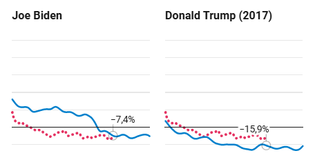 Joe Biden, in questo preciso giorno, si attestava a -7.4, nel pieno della sua discesa. Anche Gerald Ford (-1,3) non brillava particolarmente dopo 8 mesi di presidenza.