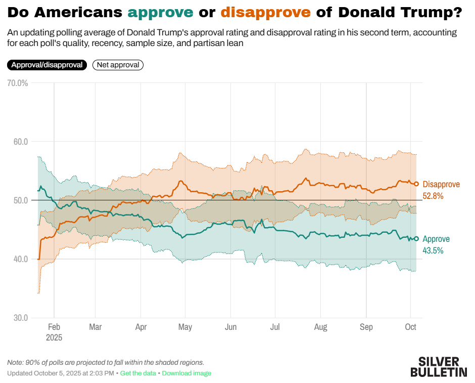 Il sito Silver Bulletin (che fa una propria media aggiustata di tutti i sondaggi, dandone un peso maggiore o minore in base al bias storico e al rating delle firme che li svolgono) segna una media generale di 43,5% (-0,2) - 52,8% (-0,3). In totale un net approval di -9,3 (+0,1).