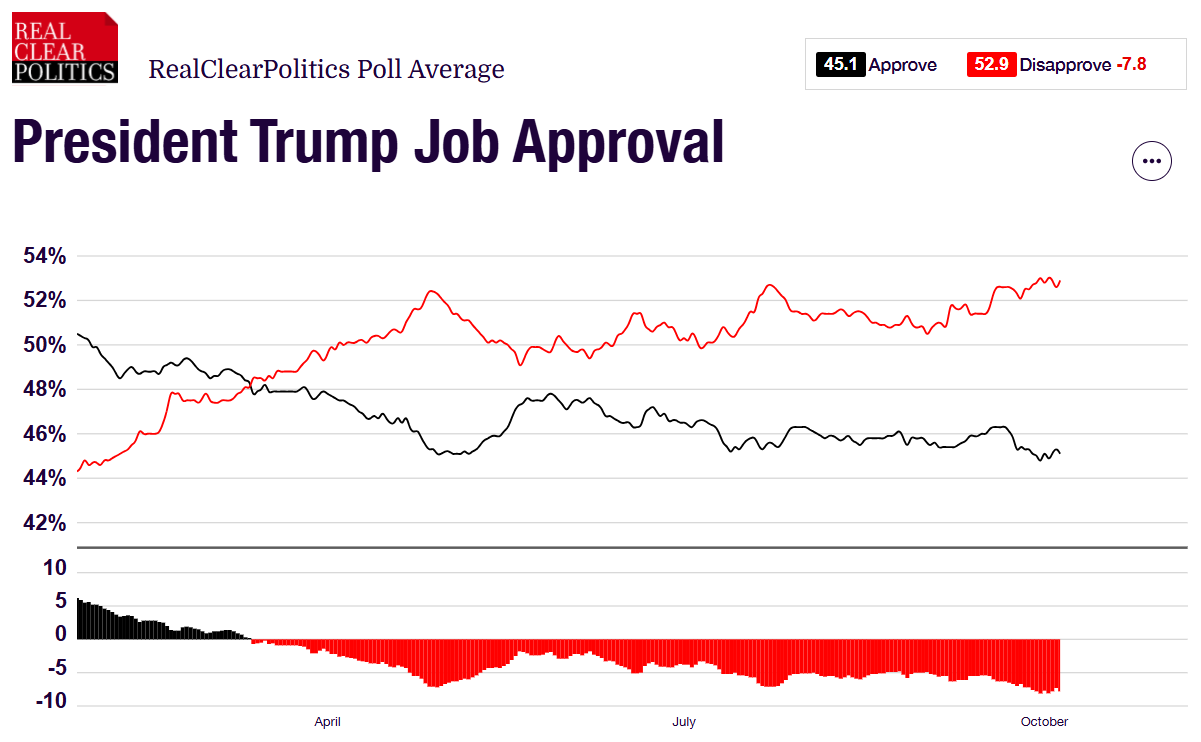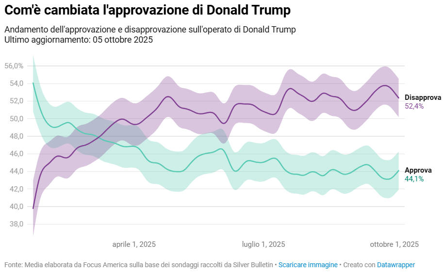 Il tasso di approvazione di Trump oscilla tra il 44% e il 45%, mentre il tasso di disapprovazione si aggira intorno al 52%-53%, numeri sostanzialmente in linea rispetto a quelli che aveva nell’ultima parte del suo primo mandato.