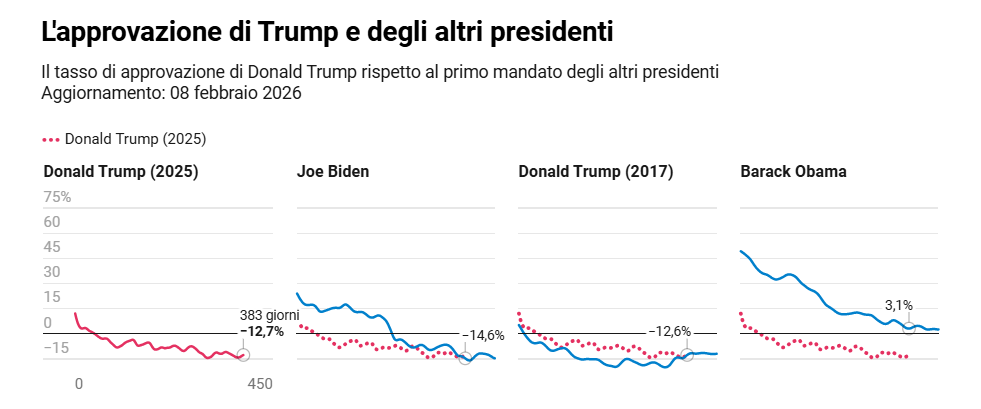 In questo momento la media di questa seconda presidenza, nonostante sia precipitata, risulta appaiata alla curva della prima; ciò significa che Trump ha al momento lo stesso tasso di popolarità che aveva nel periodo corrispondente del primo mandato, ovvero nel febbraio 2018.