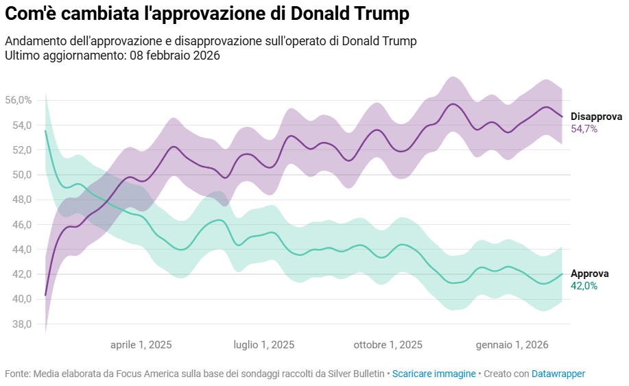 Il tasso di approvazione di Trump oscilla tra il 41% e il 42%, mentre il tasso di disapprovazione si aggira intorno al 55%, cifre simili a quelle che aveva Biden nell’ultima parte del suo mandato.