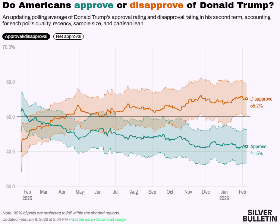 Il sito Silver Bulletin (che fa una propria media aggiustata di tutti i sondaggi, dandone un peso maggiore o minore in base al bias storico e al rating delle firme che li svolgono) segna una media generale di 41,5% (+0,3) - 55,2% (-0,6). In totale un net approval di -13,7 (+0,9).
