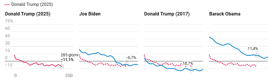 Sul nostro sito trovate i grafici con il confronto con tutti i primi mandati degli altri presidenti, con una frequenza di aggiornamento pari a 8 volte al giorno.
