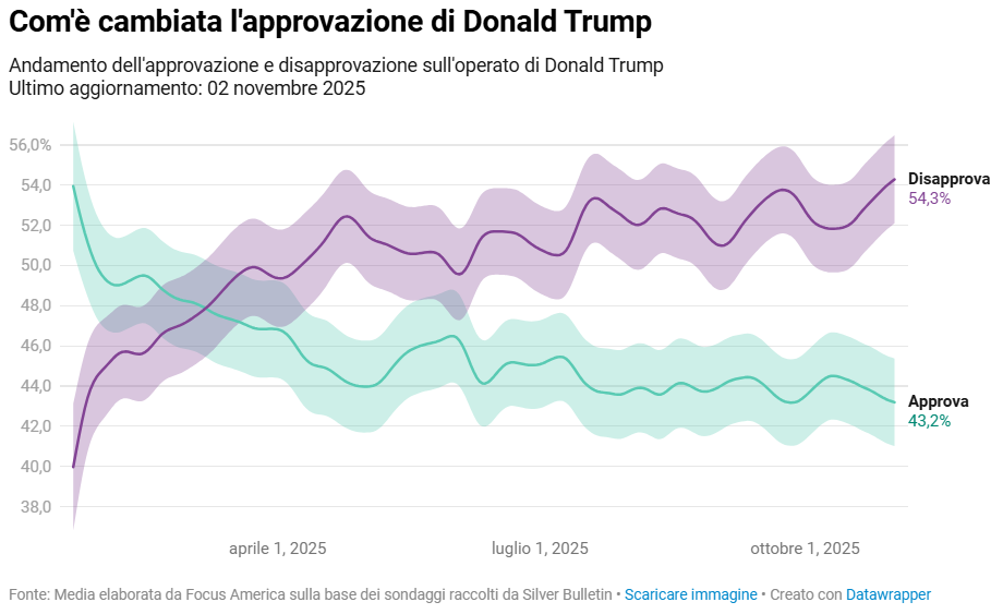 Il tasso di approvazione di Trump oscilla tra il 43% e il 44%, mentre il tasso di disapprovazione si aggira intorno al 53%-54%, numeri peggiori rispetto a quelli che aveva nell’ultima parte del suo primo mandato.