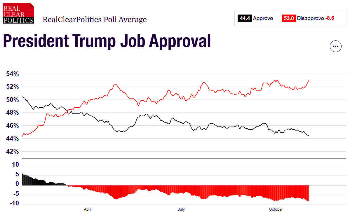 Siamo ormai giunti al 33esimo giorno di shutdown federale, che a breve sarà il più lungo della storia, e la popolarità del tycoon subisce un tracollo: dopo un periodo positivo, spinto probabilmente dall’accordo di cessate il fuoco israelo-palestinese, nelle ultime settimane i numeri hanno subito un brusco calo, toccando ora il livello più basso dall’inizio del mandato.