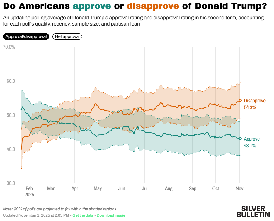 Il sito Silver Bulletin (che fa una propria media aggiustata di tutti i sondaggi, dandone un peso maggiore o minore in base al bias storico e al rating delle firme che li svolgono) segna una media generale di 43,1% (-0,6) - 54,3% (+1,4). In totale un net approval di -11,2 (-2).