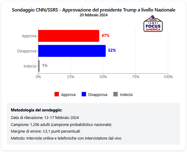 Metodologia: Il sondaggio CNN è stato condotto da SSRS dal 13 al 17 febbraio su un campione nazionale casuale di 1.206 adulti, selezionati da un panel basato sulla probabilità. Le interviste sono state realizzate online o telefonicamente con un intervistatore dal vivo. Il margine di errore per il campione completo è di ± 3,1 punti percentuali.