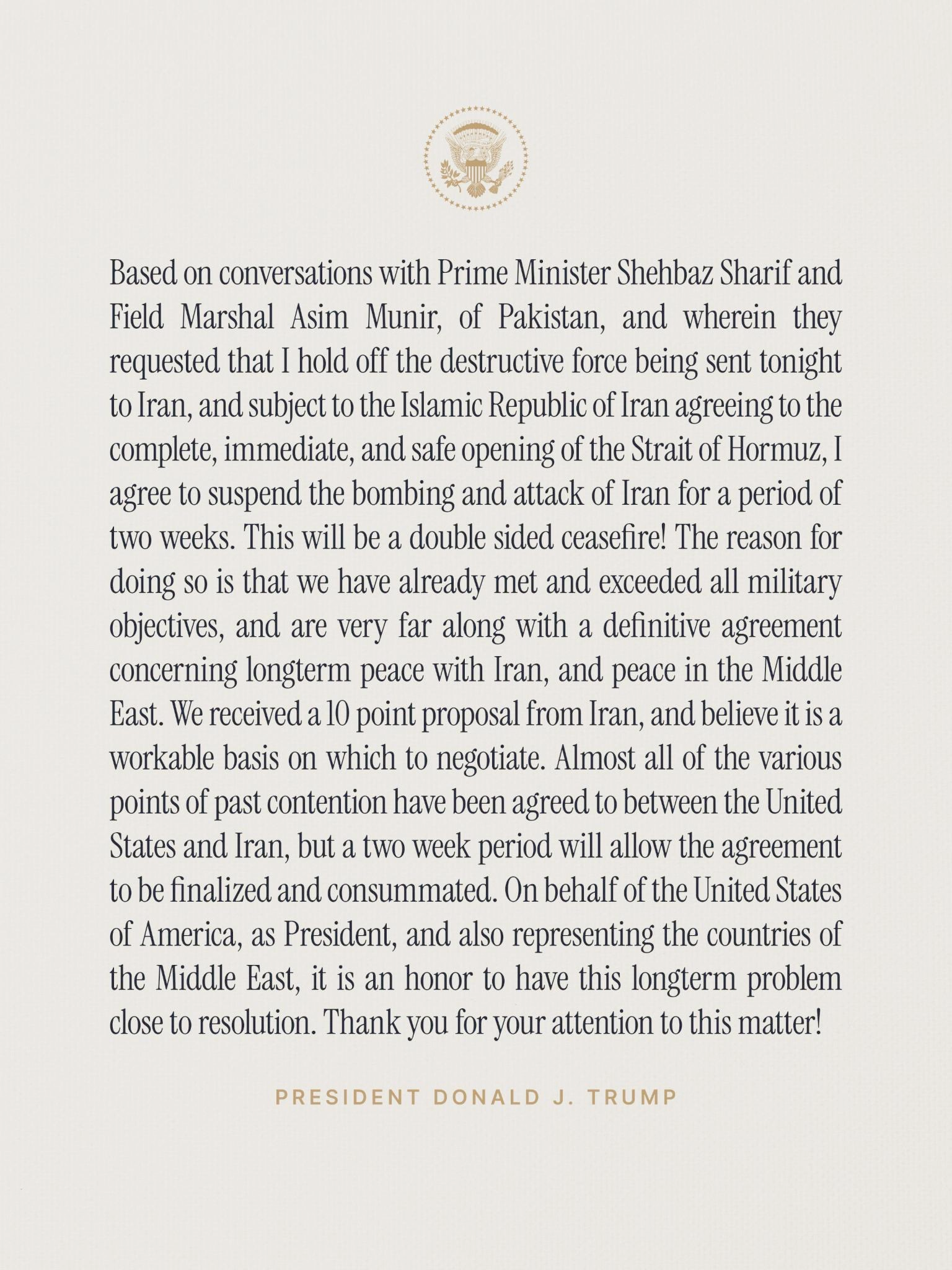 La svolta è arrivata grazie alla mediazione del Pakistan. Il primo ministro pakistano Shehbaz Sharif aveva chiesto pubblicamente a Trump di prorogare la scadenza di due settimane, e il capo di stato maggiore dell'esercito pakistano Asim Munir, che mantiene rapporti con i vertici militari iraniani, ha fatto da tramite tra le parti. Secondo tre funzionari iraniani, anche la Cina ha avuto un ruolo determinante, esercitando pressioni su Teheran affinché accettasse la proposta. Il Consiglio supremo di sicurezza nazionale iraniano ha confermato l'accordo, presentandolo come una vittoria in cui gli Stati Uniti avrebbero accettato le condizioni di Teheran. Trump, dal canto suo, ha definito l'intesa "una vittoria totale e completa" per gli Stati Uniti.