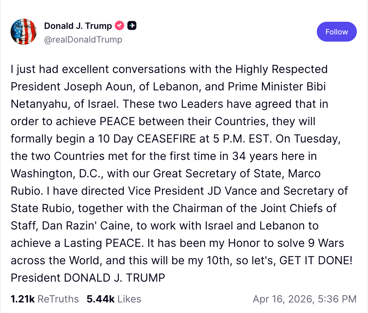 Trump annuncia un cessate il fuoco di dieci giorni tra Israele e Libano
