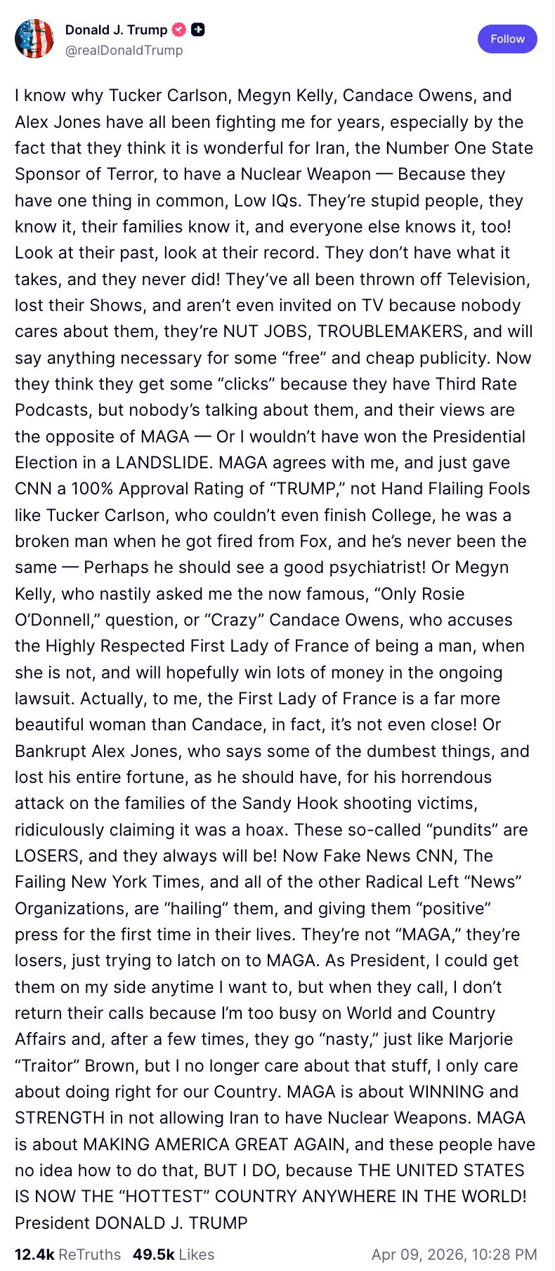 Trump li ha definiti "stupidi", "disturbati" e "piantagrane" in cerca di visibilità a sue spese, aggiungendo che "hanno una cosa in comune: un QI basso". Ha scritto di rifiutarsi ormai di rispondere alle loro chiamate e ha sostenuto che le loro posizioni sono "l'opposto del MAGA". Il presidente ha attaccato ciascuno di loro individualmente: ha detto che Carlson "dovrebbe consultare un buon psichiatra", ha definito Owens "pazza", ha descritto Jones come uno che dice "le cose più stupide" e ha ricordato che Kelly gli rivolse domande aggressive durante un dibattito del 2015. Su Owens ha aggiunto che Brigitte Macron "è una donna molto più bella di Candace", un riferimento alle ripetute affermazioni della commentatrice secondo cui la première dame francese sarebbe un uomo. Su Jones, ha ricordato la bancarotta dichiarata dopo la condanna a pagare quasi 1,5 miliardi di dollari per le sue false affermazioni sulla strage della scuola elementare di Sandy Hook. Greene è stata ribattezzata "Marjorie 'traditrice' Brown".