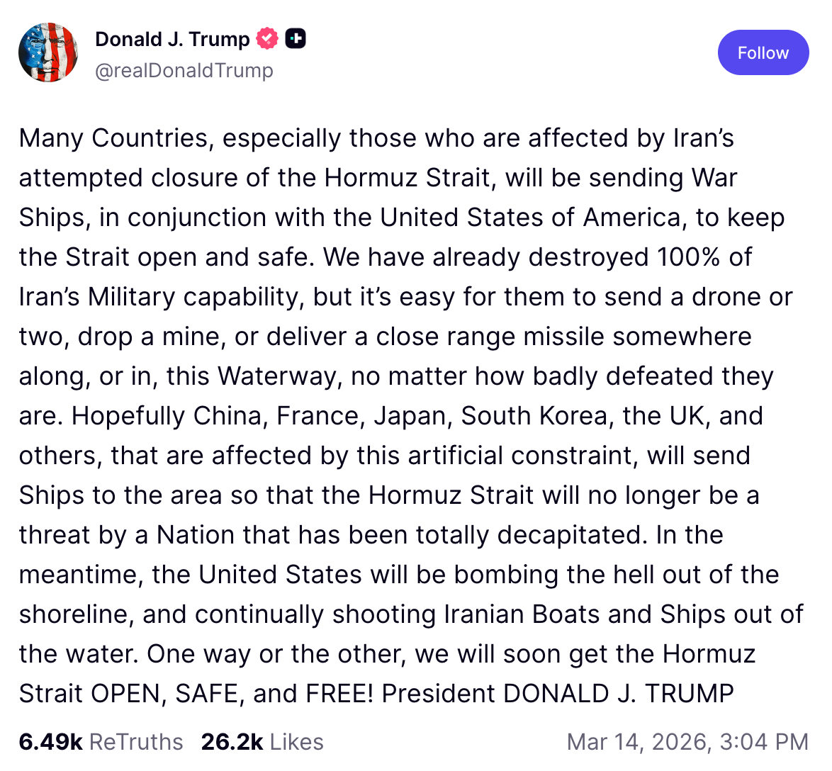 Sabato il presidente Trump ha annunciato su Truth Social che diverse nazioni invieranno navi da guerra nel Golfo per riaprire lo Stretto. "Molti paesi, specialmente quelli colpiti dal tentativo iraniano di chiudere lo Stretto di Hormuz, invieranno navi da guerra, insieme agli Stati Uniti d'America, per mantenere lo Stretto aperto e sicuro", ha scritto. Trump ha indicato Cina, Francia, Giappone, Corea del Sud e Regno Unito tra i paesi che spera si uniscano allo sforzo. Il segretario alla Difesa Pete Hegseth sta inviando la nave d'assalto anfibio USS Tripoli e la sua unità di spedizione dei Marines in Medio Oriente.