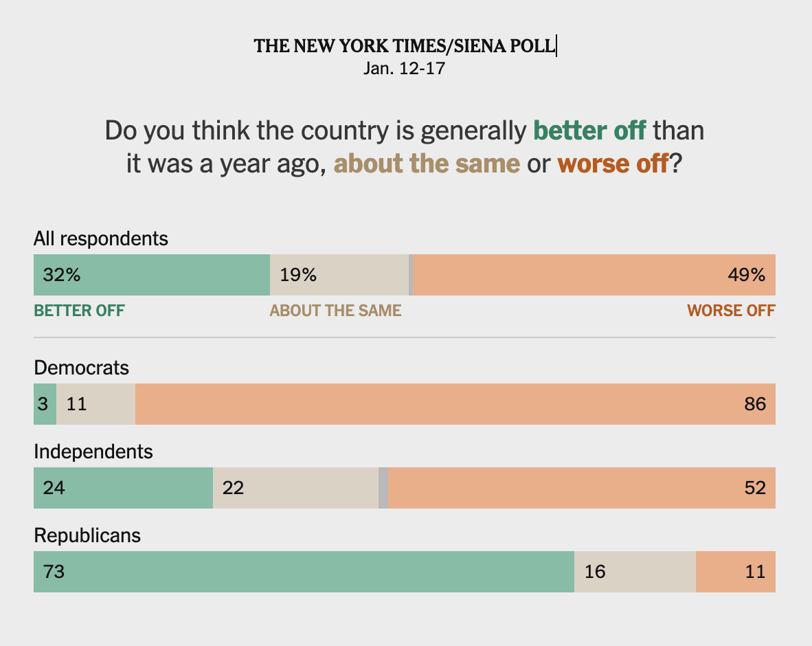 Meno di un terzo degli elettori americani ritiene che il paese stia meglio rispetto a un anno fa, quando il presidente Donald Trump è tornato alla Casa Bianca per il suo secondo mandato. Lo rivela un nuovo sondaggio condotto dal New York Times e dalla Siena University tra il 12 e il 17 gennaio su 1.625 elettori registrati. Solo il 32% degli intervistati ha dichiarato che la situazione è migliorata, mentre il 49% afferma che il paese sta peggio e il 19% che è rimasto sostanzialmente uguale.