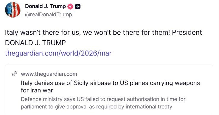 Donald Trump ha minacciato ieri di non difendere l'Italia, acuendo quella che rappresenta già ora la crisi più grave tra Washington e Roma da quando Giorgia Meloni è a Palazzo Chigi. “L'Italia non c'è stata per noi, noi non ci saremo per loro”, ha scritto il presidente americano su Truth Social, citando un articolo del Guardian sul no all'uso della base di Sigonella per gli aerei Usa, dopo giorni di precedenti attacchi alla presidente del Consiglio sulla guerra in Iran e sulle critiche a Papa Leone XIV.