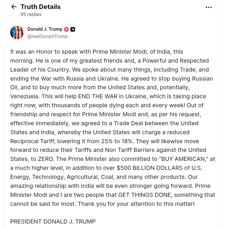 Nel messaggio pubblicato su Truth Social con cui ha annunciato questo nuovo accordo commerciale, Trump ha dichiarato di aver parlato questa mattina ora locale con il primo ministro indiano Narendra Modi, il quale — sempre secondo il presidente statunitense — avrebbe accettato di sostituire le importazioni di petrolio russo con greggio proveniente dal Venezuela e dagli Stati Uniti. Il petrolio venezuelano ha infatti caratteristiche simili a quello russo: è un greggio pesante ad alto contenuto di zolfo e risulta particolarmente adatto alla produzione di derivati come olio combustibile e diesel.