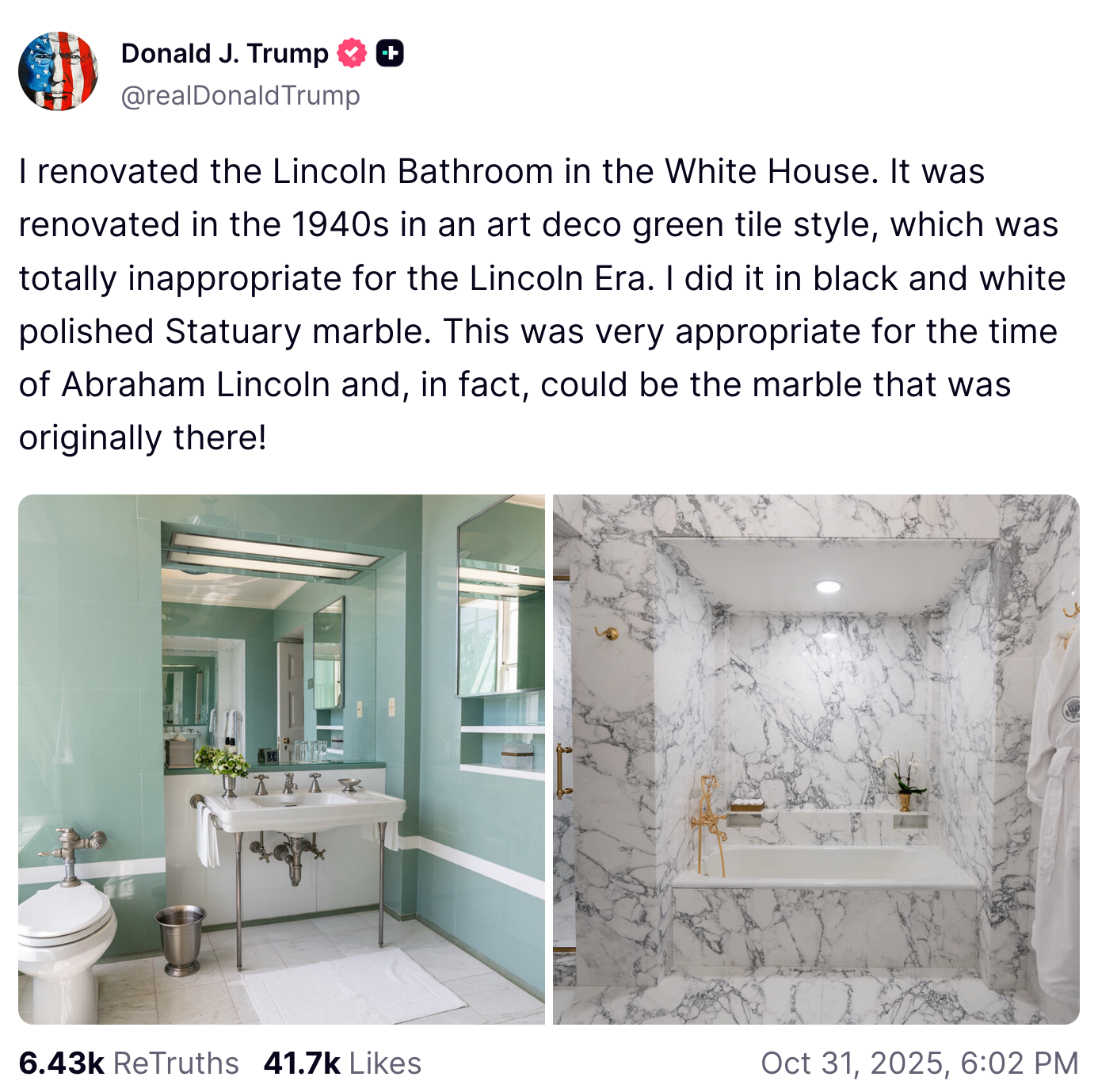 "Ho ristrutturato il bagno di Lincoln alla Casa Bianca", ha scritto Trump. "Era stato rinnovato negli anni Quaranta in uno stile Art Déco con piastrelle verdi, che era totalmente inappropriato per l'era di Lincoln. L'ho fatto in marmo statuario lucido bianco e nero. Era molto appropriato per l'epoca di Abraham Lincoln e, infatti, potrebbe essere il marmo che c'era originariamente".